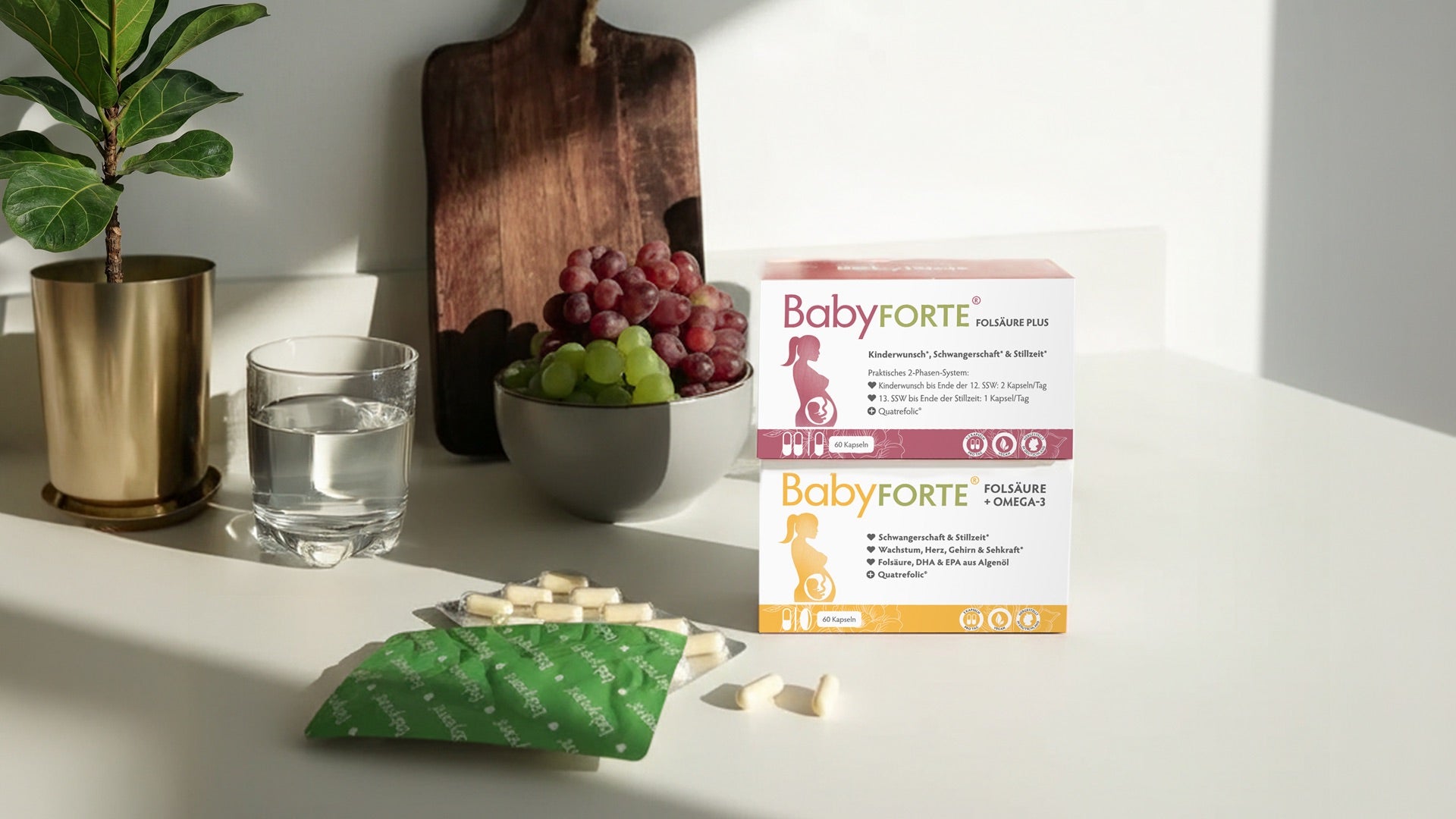 Für Schwangerschaft & Stillzeit: BabyFORTE Folsäure Plus (bis Ende 12. Woche) unterstützt die Frühschwangerschaft mit 800 µg Folsäure (mit Quatrefolic®) für Zellteilung und Wachstum des mütterlichen Gewebes. Ab der 13. Woche sorgt BabyFORTE Folsäure + Omega-3 mit 18 Nährstoffen, darunter DHA & EPA aus Algenöl, Folsäure (mit Quatrefolic®) und Vitamin D, für eine optimale Versorgung von Dir und Deinem Baby
