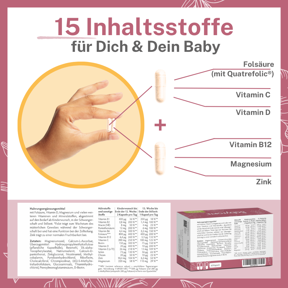 - Kraftvolle Formel: In BabyFORTE® FolsäurePlus ohne Jod sind insgesamt 15 Inhaltsstoffe enthalten, wie Folsäure, Vitamin B6, Zink, Vitamin D und viele weitere.