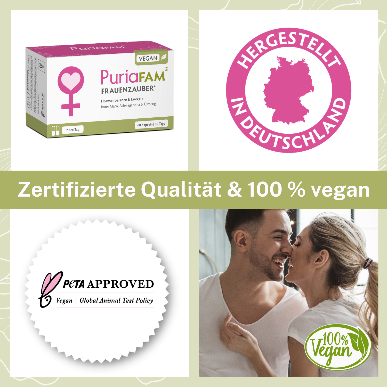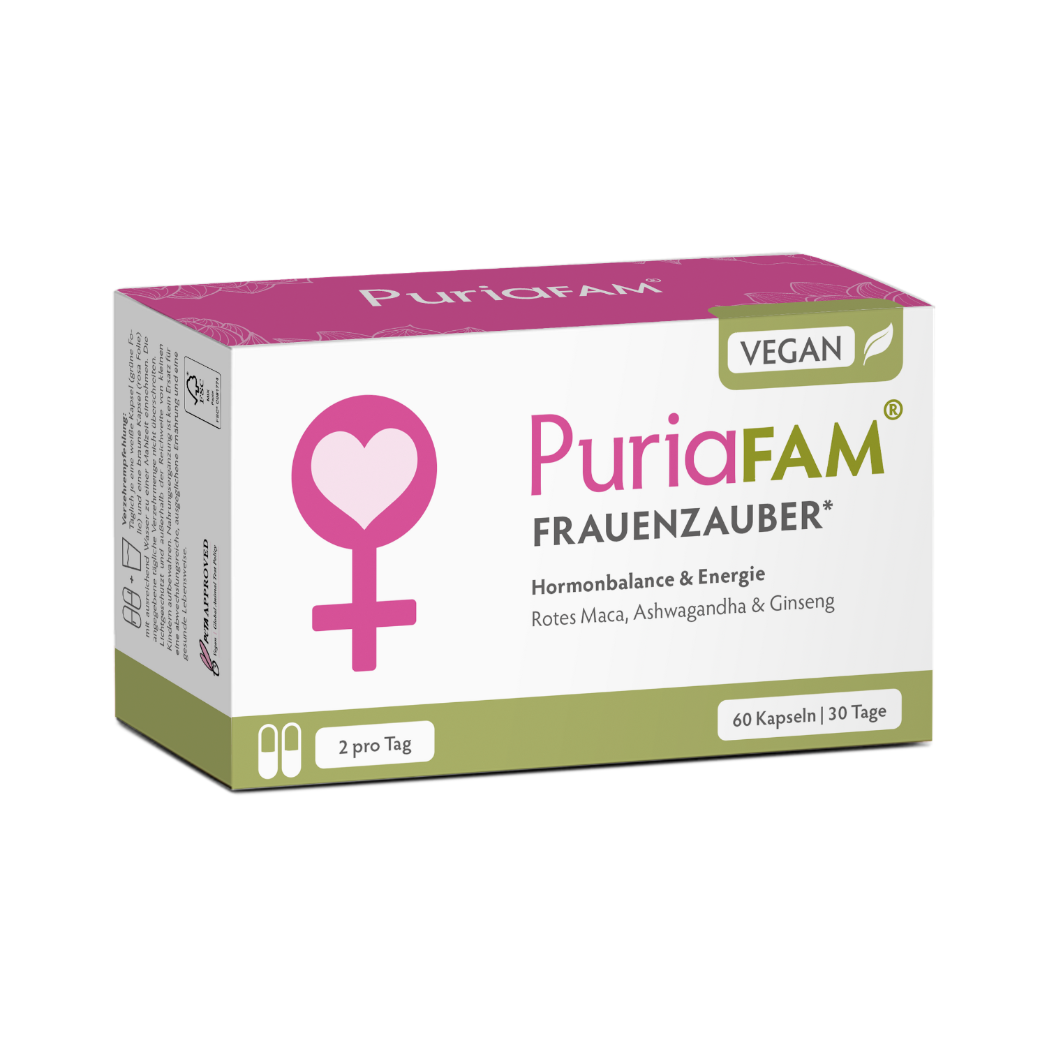 - Das Besondere an PuriaFAM® Frauenzauber: Vegane Formel mit rotem Maca, Ashwagandha, Passionsblumen-Extrakt, Ginseng und weiteren hochwertigen Inhaltsstoffen.